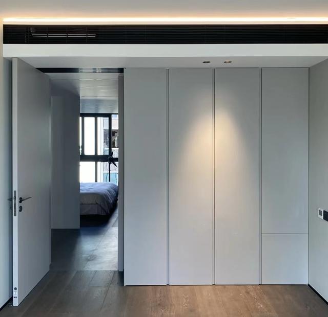 一门到顶的衣柜,顾名思义是衣柜与地和顶无缝连接,它的优势是整体性好,简约大气,但是存在门板容易变形问题,即使是装了拉直器,也难完全解决变形问题。