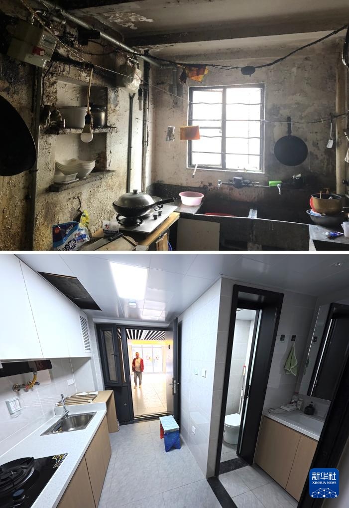 拼版照片:上图是改造前的漕溪三村小区居民共用厨房(资料照片,);下图是拆除重建后的漕溪三村小区室内独立厨房和卫生间(2025年10月23日摄,记者方喆摄)。